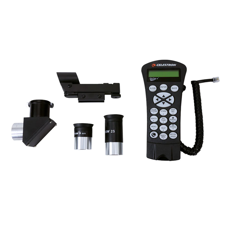 Bộ sản phẩm bao gồm: Ống quang, giá đỡ và giá ba chân, khay phụ kiện, NexStar + Điều khiển bằng tay, thị kính 20mm và 9mm, kính tìm chấm đỏ StarPointer ™, gương chéo